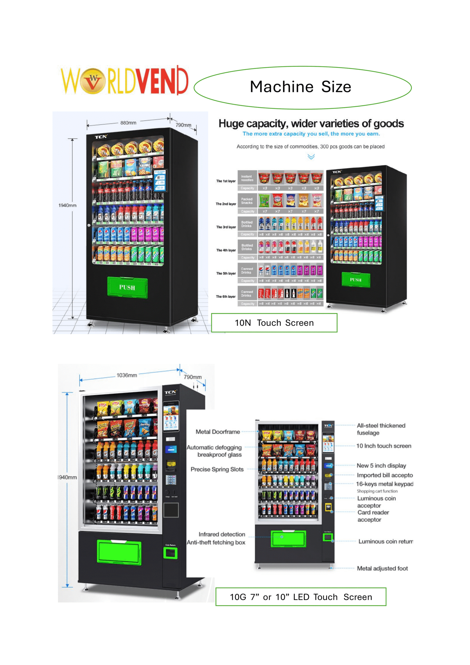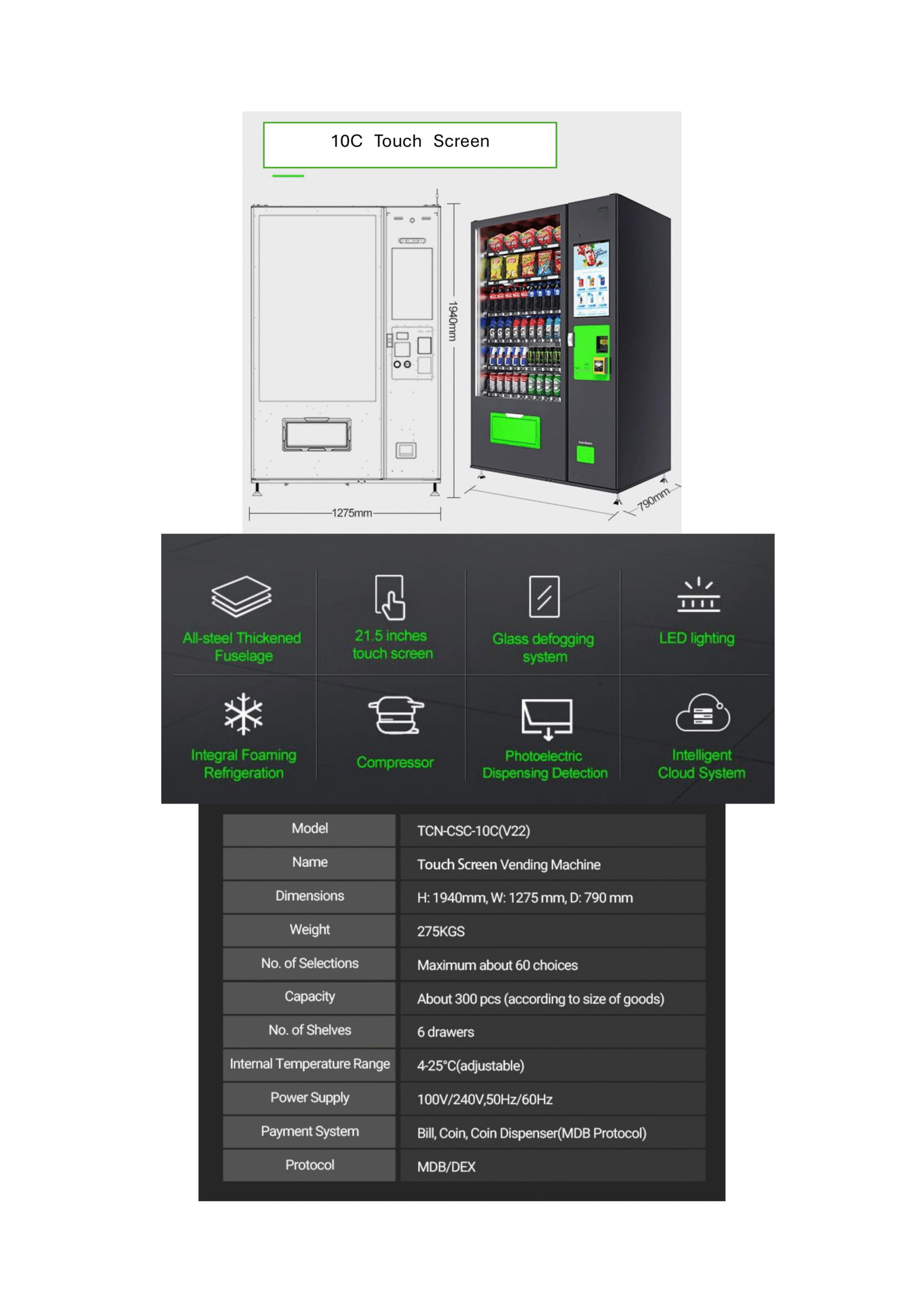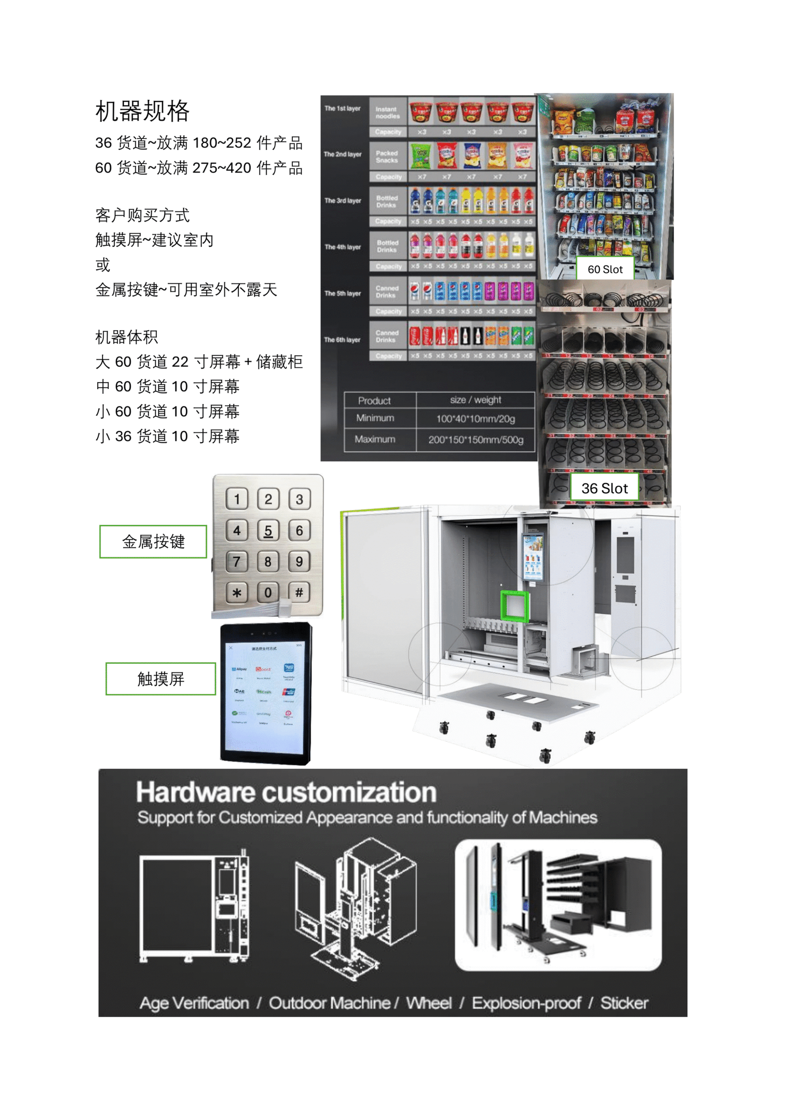 总结:适合 Combo机,制冷、电子钱包、触摸屏 22"、储藏柜60货道,可放300件以上商品。