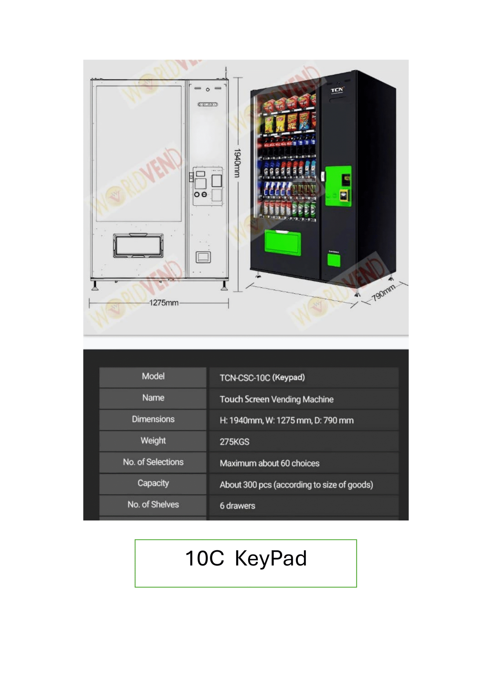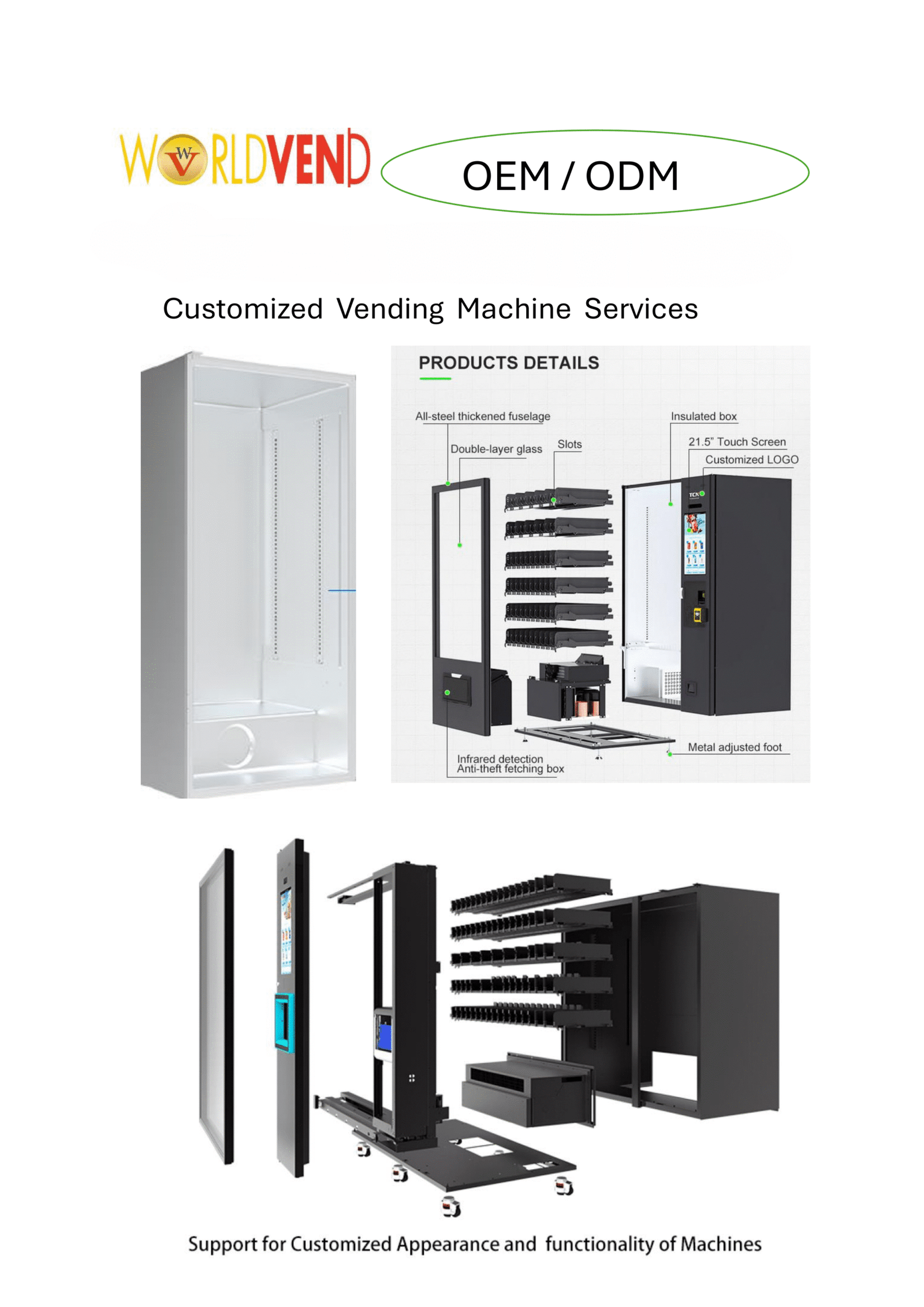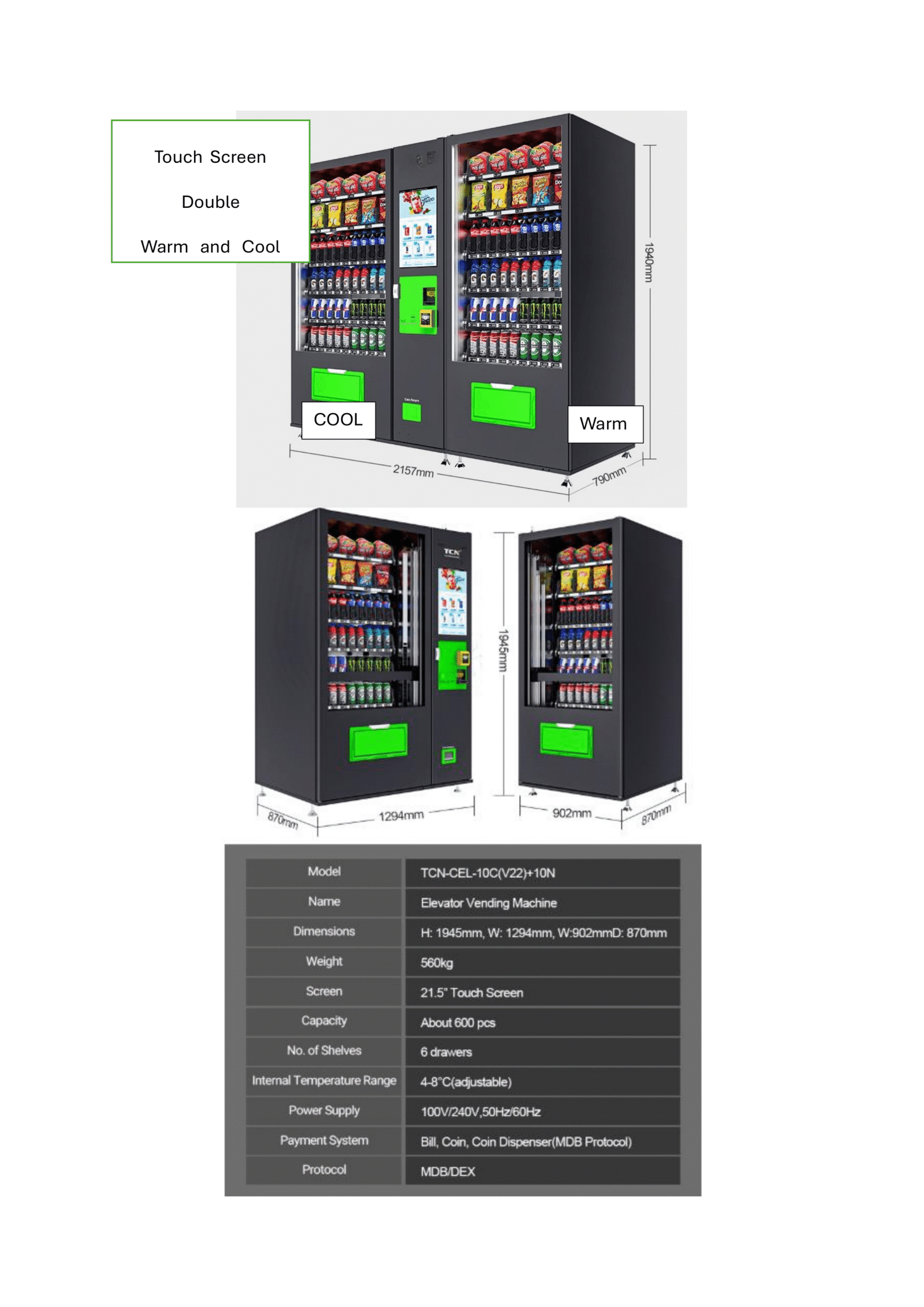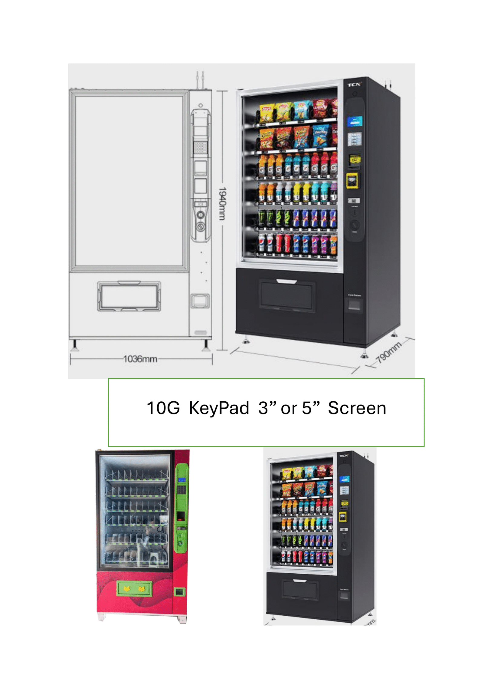 总结:适合 Combo机,制冷、电子钱包、触摸屏 22"、储藏柜60货道,可放300件以上商品。
